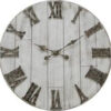 Modern white wooden wall clock trimmed in black with a time only quartz movement. 1 AA Battery